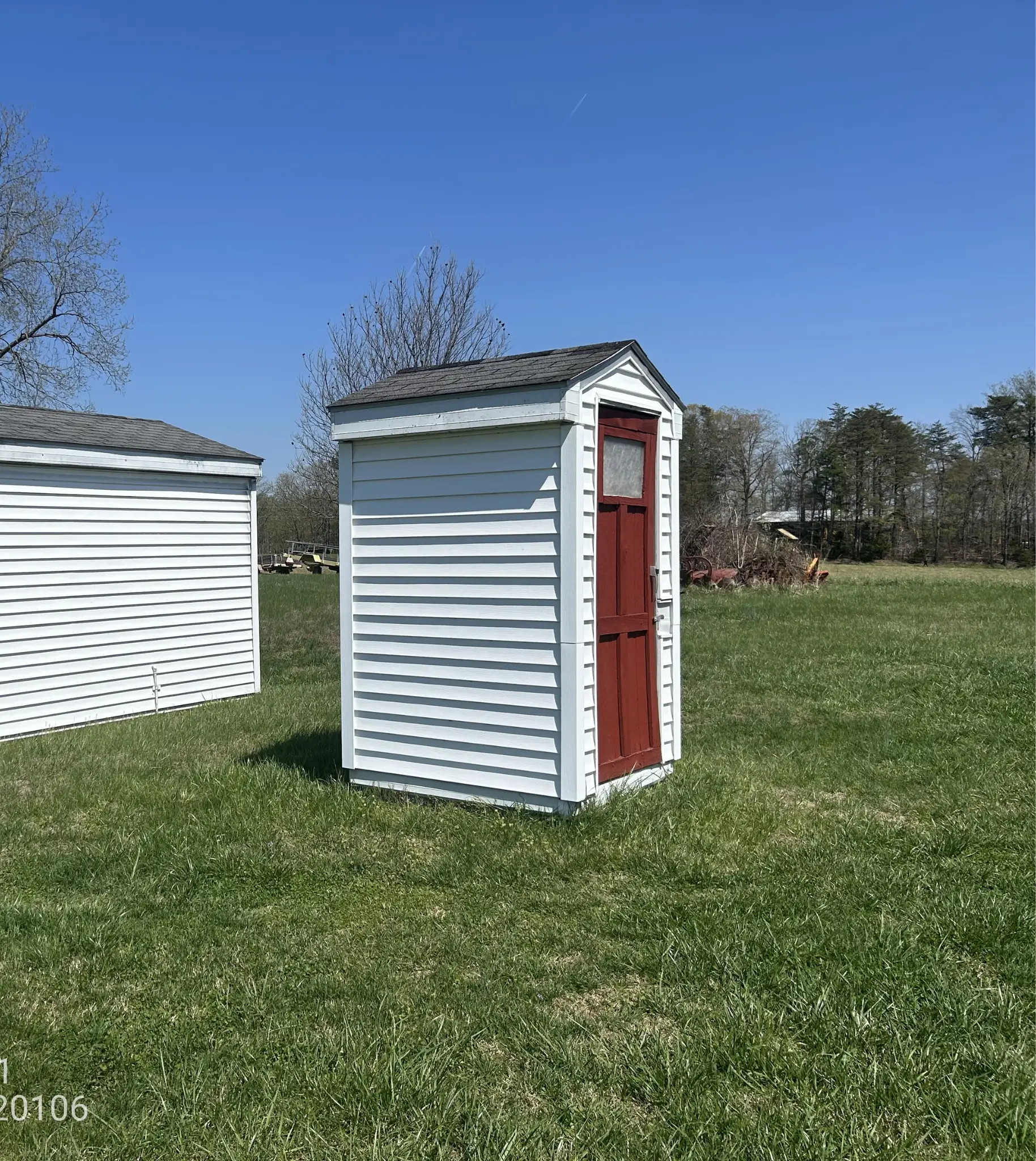 The work covered three detached outbuildings on the back-left side of the property. Total coverage came out to roughly 10 squares of shingles across the three buildings.