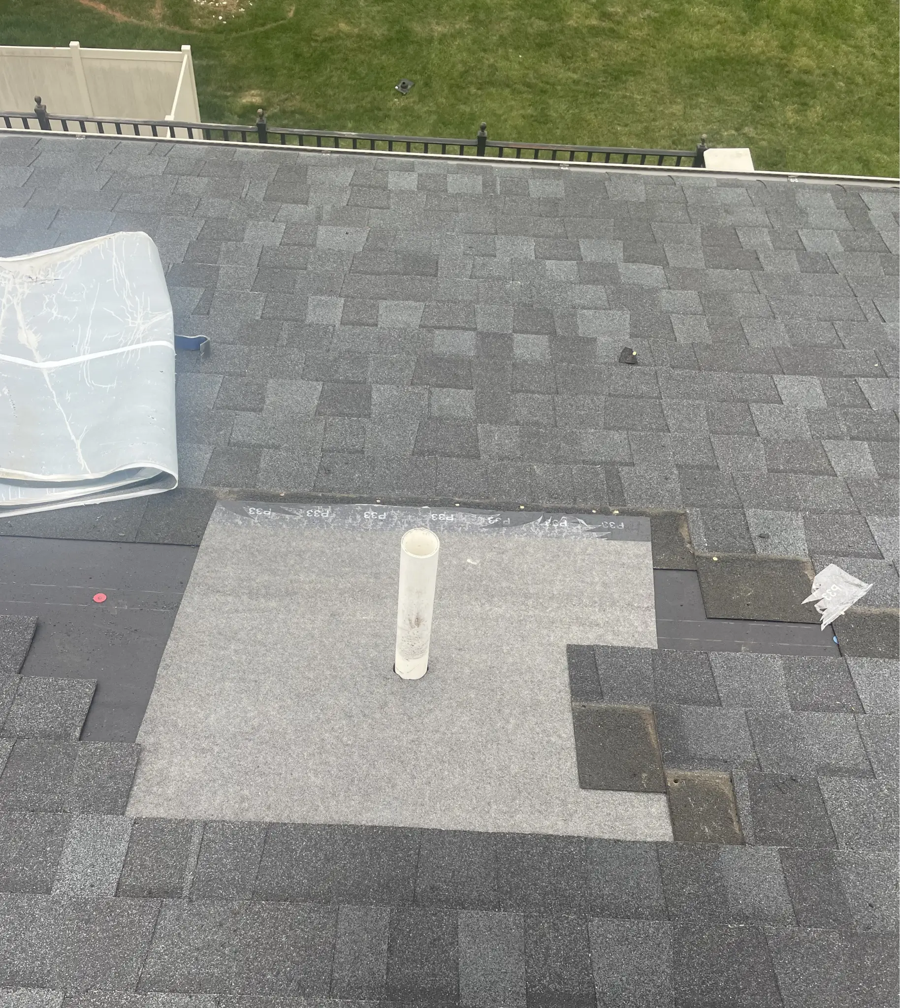 Our Charlottesville crew accessed the back roof from the 4th-level deck — the townhouse geometry made that the cleanest approach — and completed the roof repair in a single day. Here's what went into the repair section: